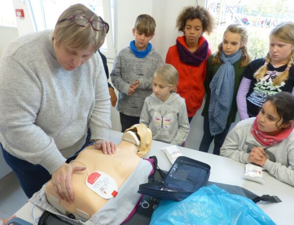 Die Kinder erzählten von Unfallsituationen, die sie selbst erlebt oder miterlebt haben, stellten viele Fragen zum Beruf des Unfallsanitäters und lernten einiges über die Wiederbelebung und Maßnahmen der Ersten Hilfe.