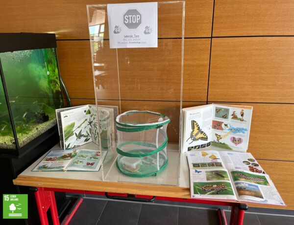 Die beliebten Fische unseres Schulaquariums in der Mensa haben besondere Nachbarn bekommen. Seit einigen Wochen wachsen hier junge Distelfalter heran  -  also Schmetterlinge.