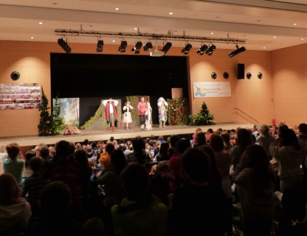 Gemeinsam sind alle Klassen heute zum Burggymnasium gelaufen. Es stand nämlich ein Theaterbesuch auf dem Programm. „Von einem der auszog, das Fürchten zu lernen“ wurde von der Märchenkompanie Köln aufgeführt.