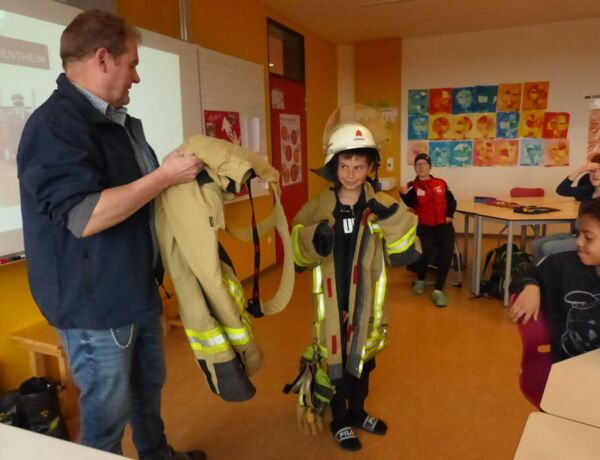 Alle dritten Klassen wurden von Eltern besucht, die in der Freiwilligen Feuerwehr Bad Bentheim sind. Wir konnten ganz viel fragen. Der Feuerwehrmann hatte seine Einsatzkleidung dabei und hat uns erklärt, dass die Ausrüstung von der Feuerwehr sehr schwer ist. Jeder durfte sie einmal hochheben und sie war wirklich sehr schwer.