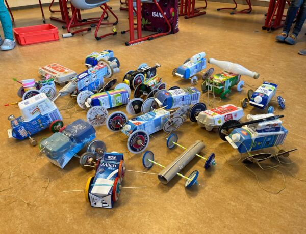 Zur Zeit werden in den ersten Klassen im Sachunterricht Räderfahrzeuge aus Alltagsmaterialien, wie zum Beispiel leere Milchkartons, Strohhalmen oder Eierkartons, gebaut.