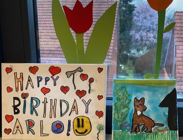 Heute hatte unser Schulhund Arlo Geburtstag. Er ist vier Jahre alt geworden und das wurde in den Klassen, in denen Arlo heute war, gefeiert.