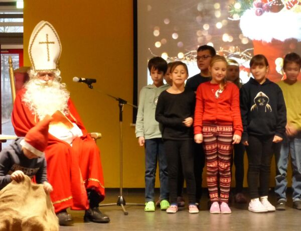 Am Freitag war der Nikolaus auch bei uns in der Schule. Die Kinder begrüßten ihn singend und dann kam er endlich die Treppe herunter zu uns ins Foyer, wo schon alle ganz gespannt auf ihn warteten.