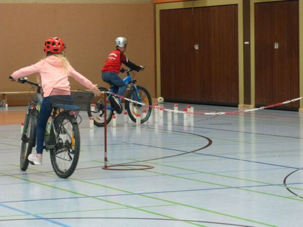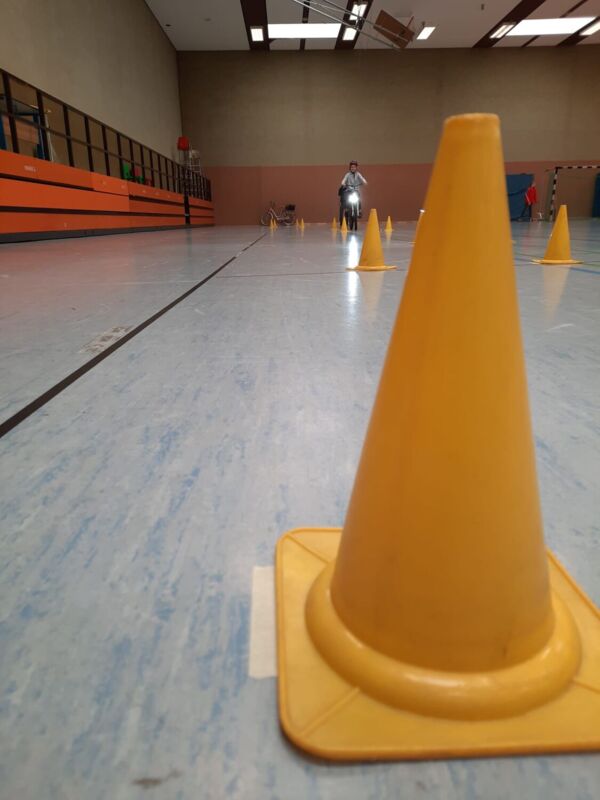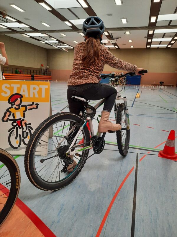 Die Kinder übten fleißig, die Hindernisse des Parcours zu meistern, fuhren über dünne Balken, transportierten eine Kette mit der einen und mit der anderen Hand, fuhren durch einen Parcours, schauten sich um, gaben Handzeichen und bremsten am Ende vor einer Absperrung ab. Am Freitag fand die Fahrradprüfung statt und die Kinder zeigten, wie gut sie mit dem Fahrrad in verschiedenen Situationen umgehen können.