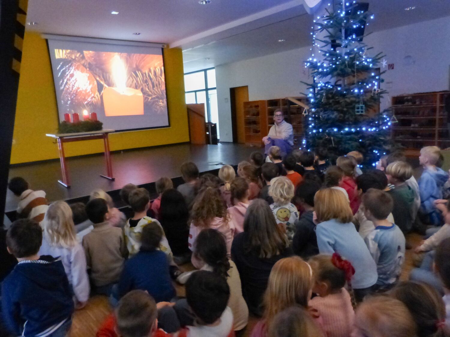 Am Montag sind wir als Schule gemeinsam in die Adventszeit gestartet und haben uns zum Singen im Foyer getroffen. Mit funkelnder Lichterkette am selbst geschmückten Weihnachtsbaum und der ersten angezündeten Kerze auf dem Adventskranz sangen die Kinder und Lehrer gemeinsam Weihnachtslieder und stimmten sich auf die kommende Weihnachtszeit ein. Beim Klassiker „Dicke rote Kerzen“ wurde begeistert mitgeklatscht und nochmal etwas lauter gesungen.