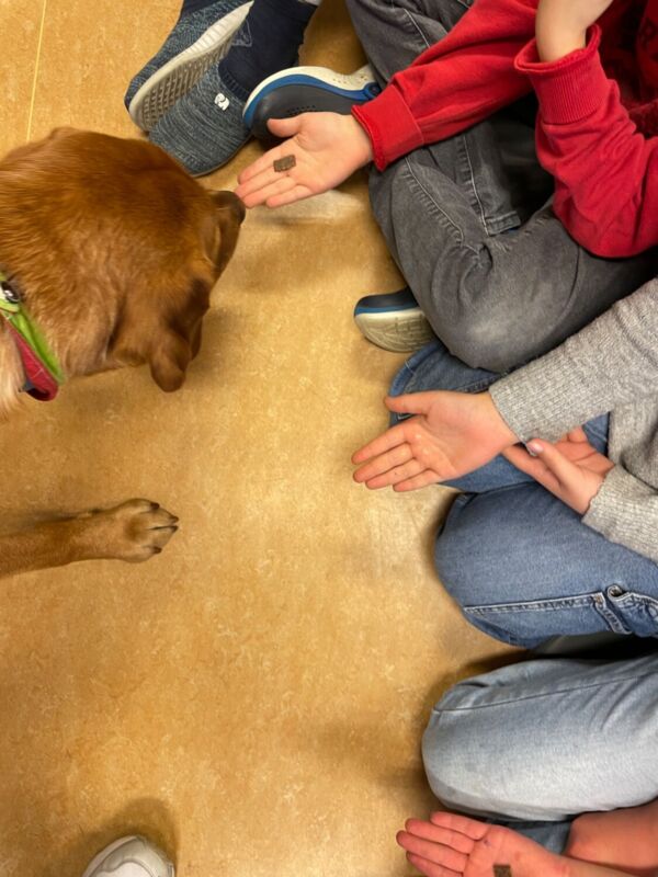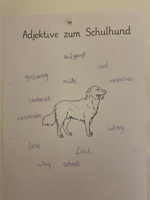 Gemeinsam lernten die Kinder das Adjektiv als neue Wortart kennen und sammelten gleich eine Vielzahl an Adjektiven, mit denen sie den Geburtstagshund beschreiben konnten. Während in der letzten Stunde eine Geschichte vorgelesen wurde, durften die Kinder ihn nacheinander streicheln und den Unterrichtstag mit einer Leckerchen-Runde abschließen.