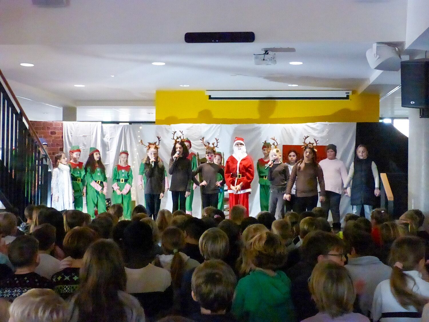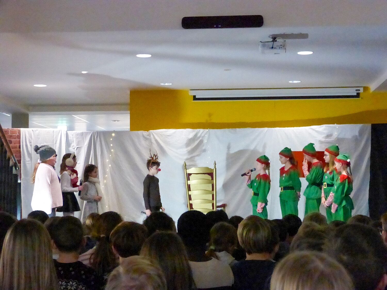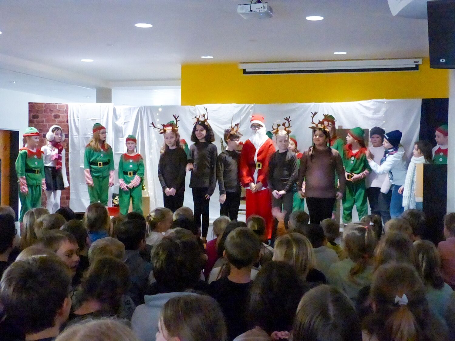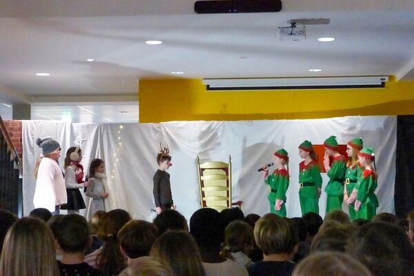 In dem Stück geht es darum, dass Rudolf wegen seiner roten Nase ausgelacht wurde. Dann hat sich ein Rentier (Dancer) verletzt, das den Schlitten des Weihnachtsmannes anführen sollte, und Rudolf musste einspringen. Doch Rudolf war verschwunden und die Wichtel mussten ihn suchen. Die Wichtel haben Rudolf in der Stadt gesucht, wo er immer ist, weil die Kinder ihn so mögen. Die Kinder hatten Rudolf zu der Zeit schon gesehen und ihn in die Schule zur Weihnachtsfeier eingeladen. Dann haben die Wichtel die Schule gesehen und wer war zwischen den ganzen Kindern? Rudolf! Die Wichtel haben sich gefreut und Rudolf gesagt, dass er mitkommen soll. Rudolf sagte „ Ja!“ und so endete das Stück. Ob es uns gefallen hat? Und wie! Wir fanden das Stück so toll, dass es zwei Zugaben gab.