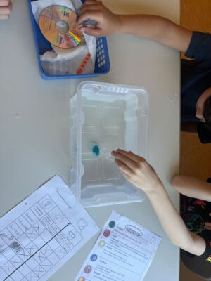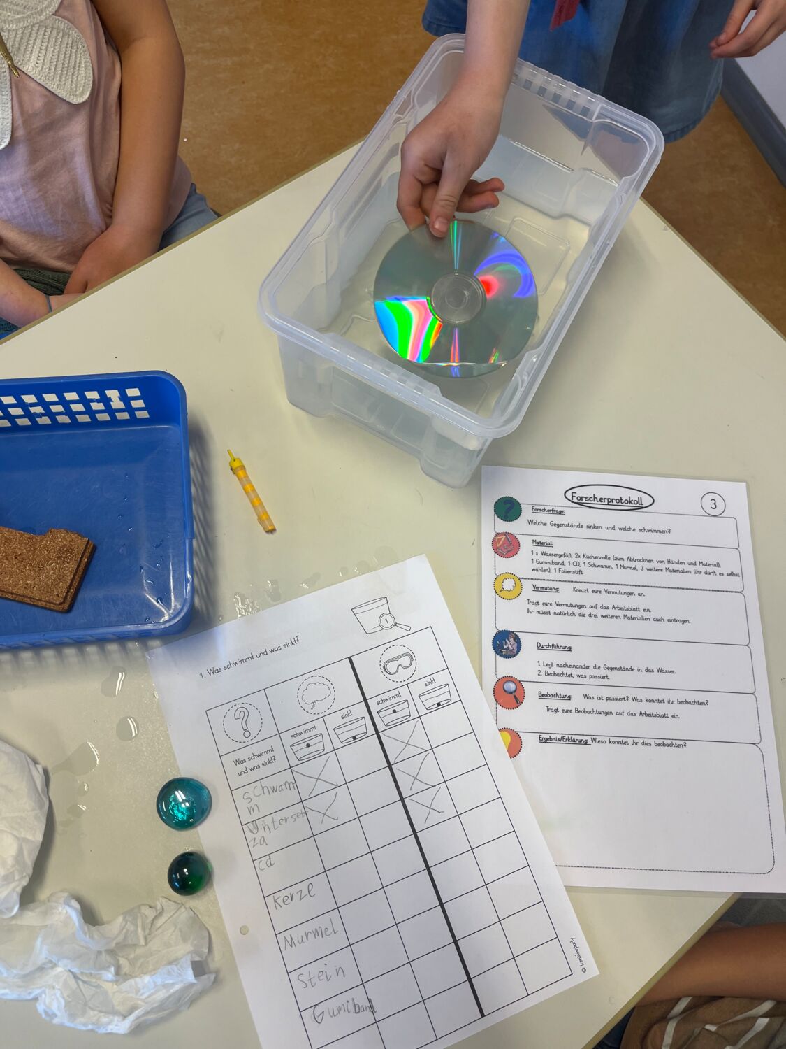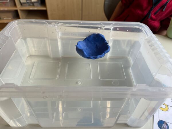 Mit viel Eifer wurden in Kleingruppen verschiedene Materialien in Hinblick auf ihre Schwimmfähigkeit untersucht und verglichen. Zum krönenden Abschluss verwandelten die Kinder eine eigentlich sinkende Knetkugel in ein schwimmendes Schiffchen und probierten natürlich auch seine Tragfähigkeit aus. Welches Schiff hat wohl am längsten durchgehalten?