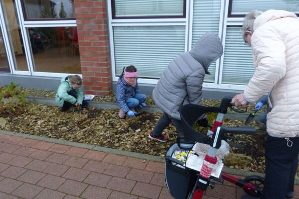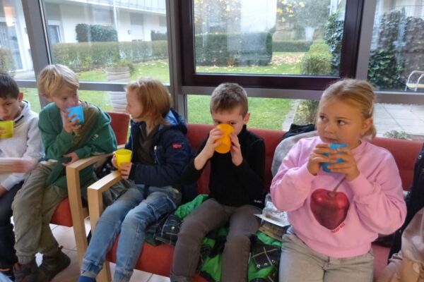 Direkt um 8 Uhr ging die Klasse gemeinsam zum Altenheim. Jedes Kind trug stolz ein paar der Säckchen mit den Zwiebeln. Da die Bewohnerinnen und Bewohner nach dem Frühstück noch einen Moment zum Jacke anziehen benötigten, wurden die Kinder so lange mit Kakao, Tee und Wasser versorgt und warteten geduldig in der Eingangshalle, bis es endlich losgehen konnte.