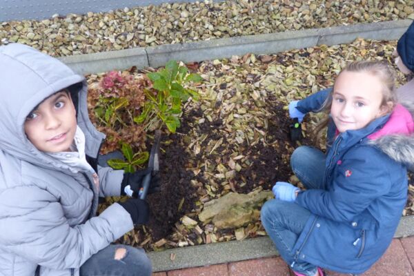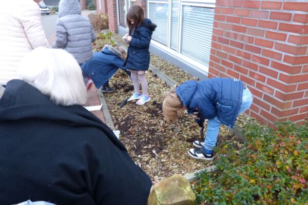 Als alle da waren, wurde sich aufgeregt darüber ausgetauscht, wo die Zwiebeln gepflanzt werden könnten und was die beste Strategie wäre. Die Kinder gruben fleißig Löcher, legten die Zwiebeln, die die Bewohnerinnen und Bewohner ihnen anreichten, vorsichtig hinein und verschlossen die Löcher wieder. Einige Regenwürmer kamen zum Vorschein, die die Kinder behutsam zur Seite beförderten, um weiter pflanzen zu können.
