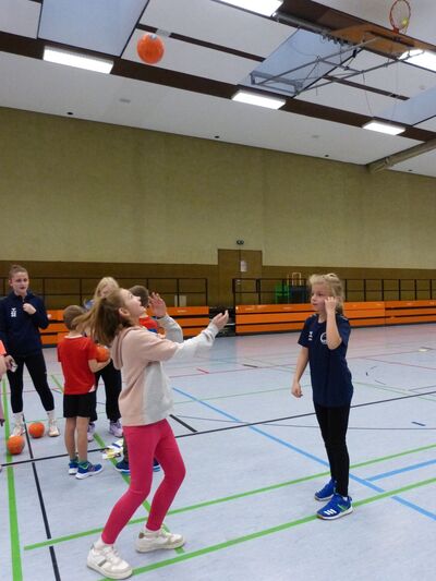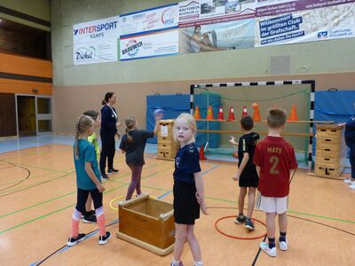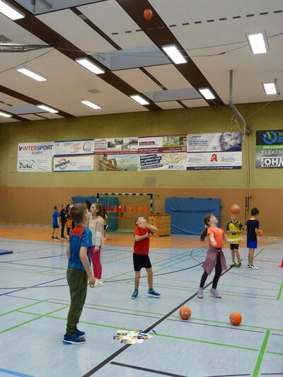 Beim geschickten Laufen, Werfen, Koordinationsübungen und Prellen konnten Punkte gesammelt werden. Zur gleichen Zeit wurde auf zwei anderen Spielfeldern „Aufsetzerball“ und ein reguläres Handballspiel gespielt.