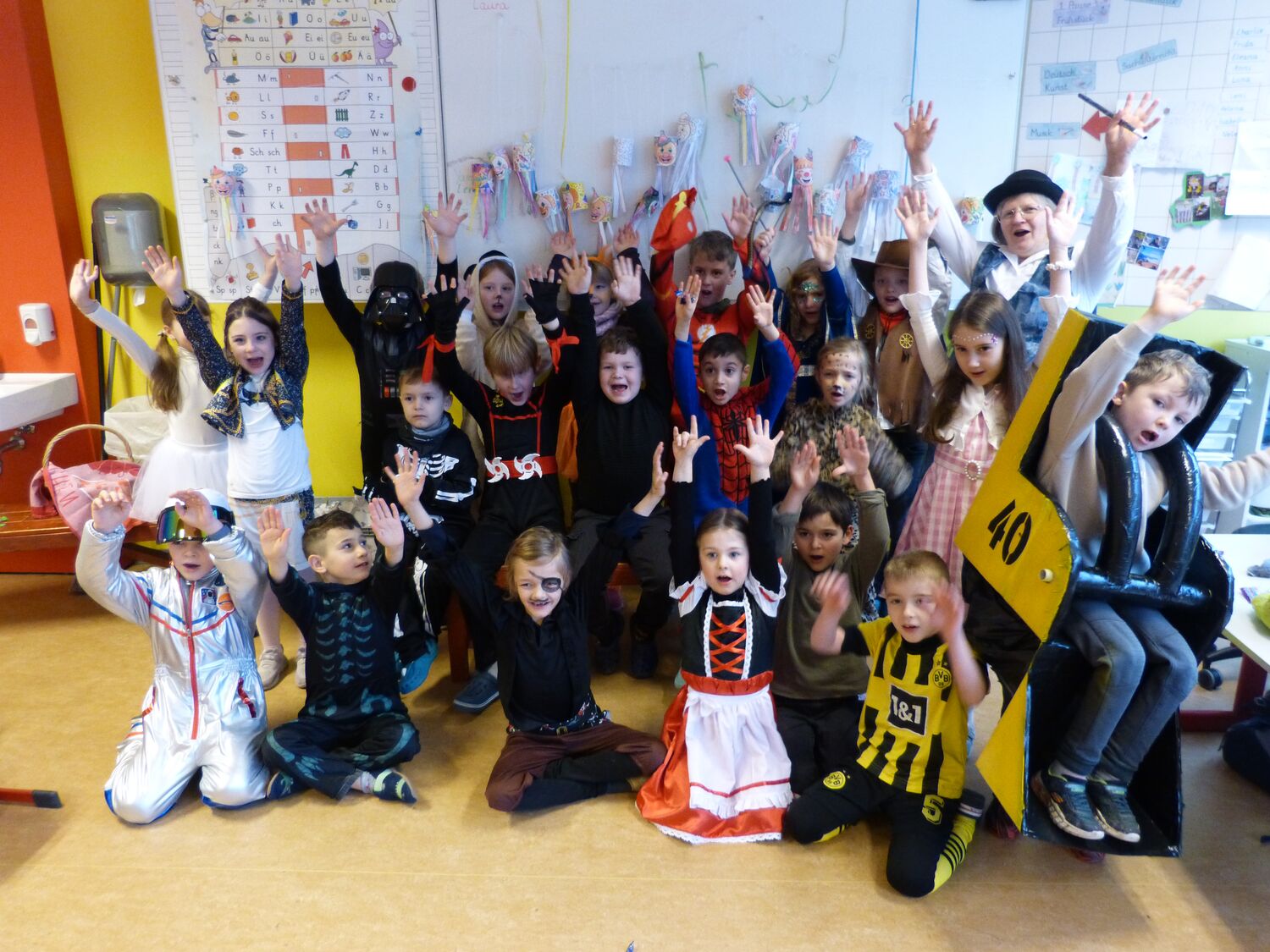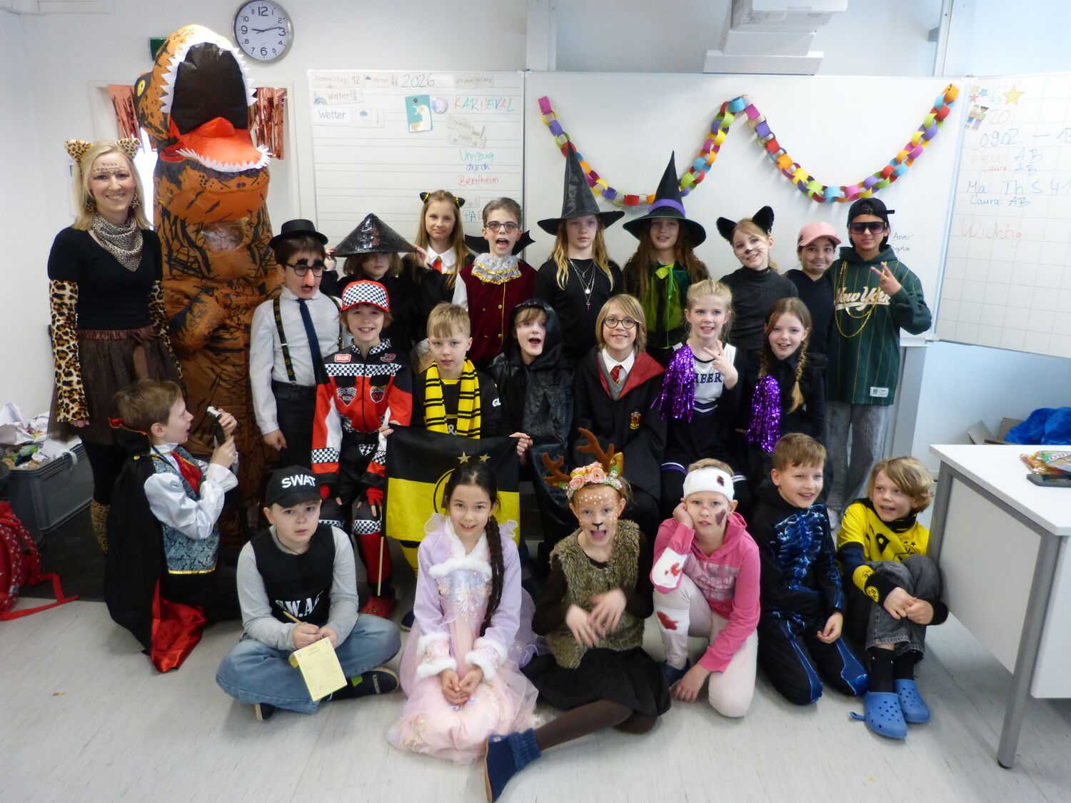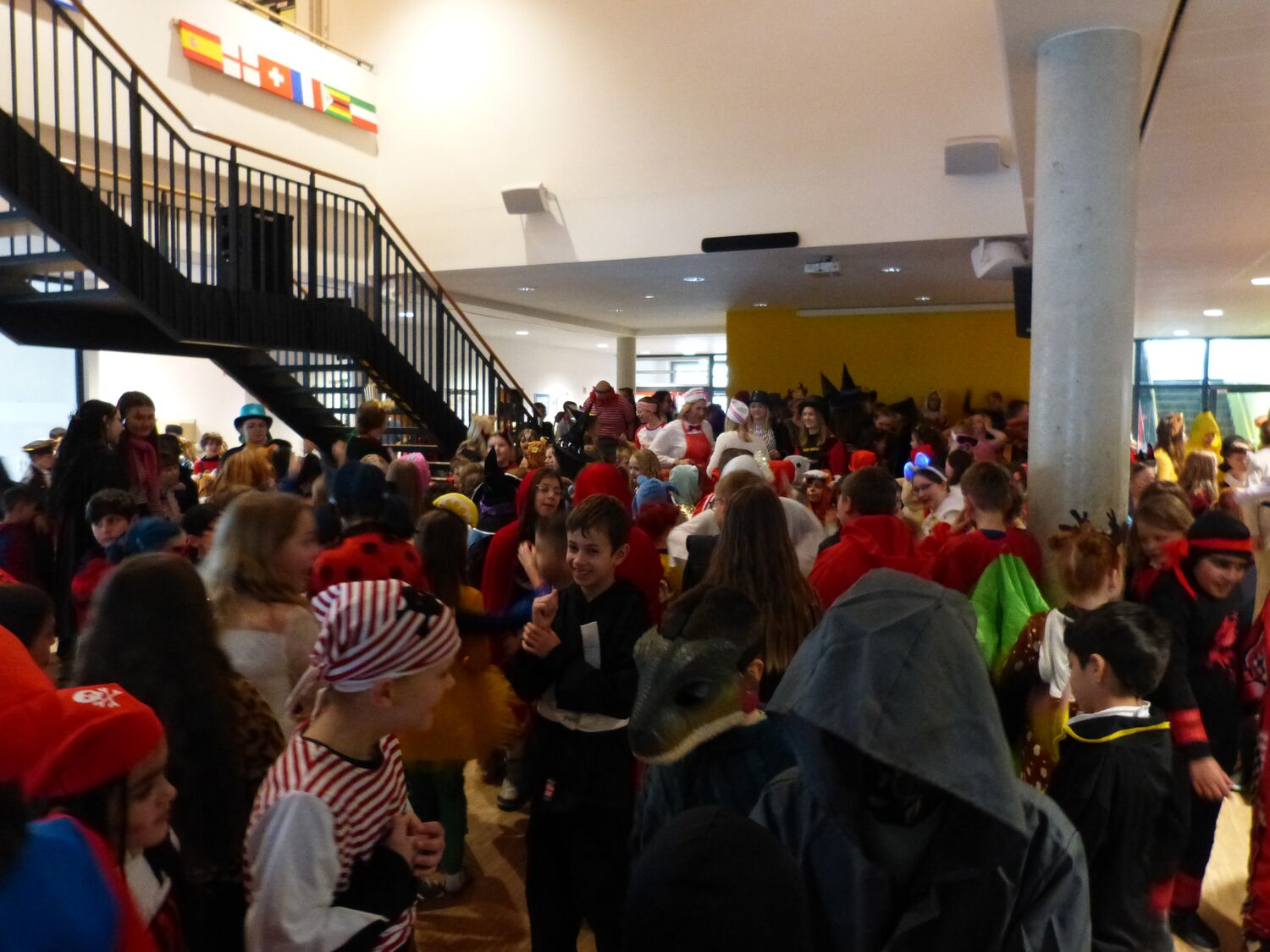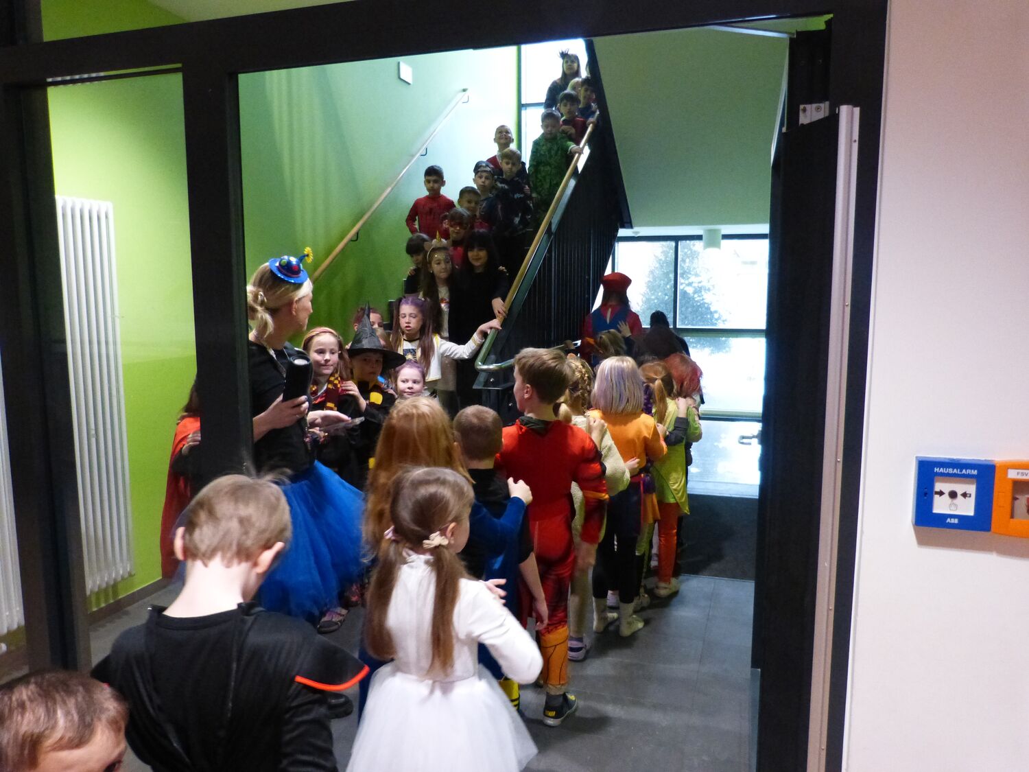 Dort wurde getanzt, gelacht und gespielt. Nach einer Polonaise durch die Schule tanzten alle Kinder ausgelassen in der Aula. Im Anschluss wurden die Jacken übergezogen und Tüten zum Süßigkeiten sammeln bereit gemacht, denn wie jedes Jahr machten wir mit der gesamten Schule einen Rundgang durch Bad Bentheim. Der Streckenplan wurde im Vorhinein bekannt gegeben, sodass viele Eltern an den Wegen entlang Süßigkeiten warfen und die Kostüme der Kinder bestaunen konnten.
