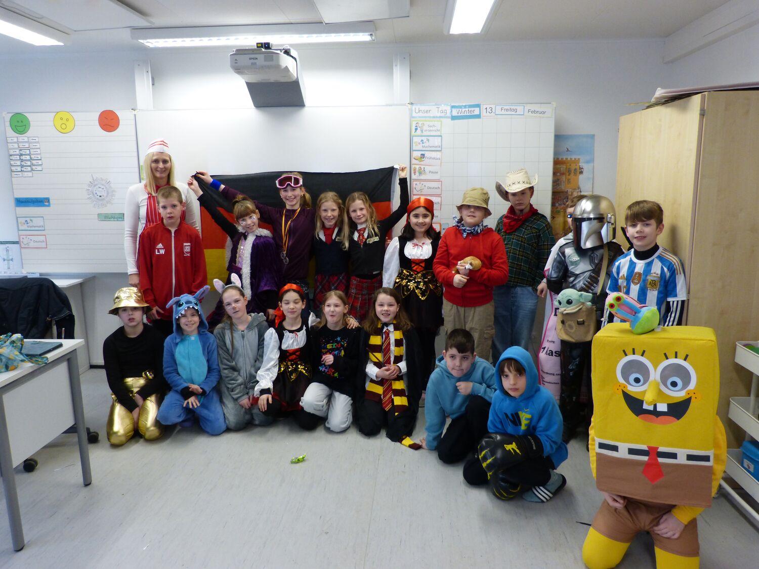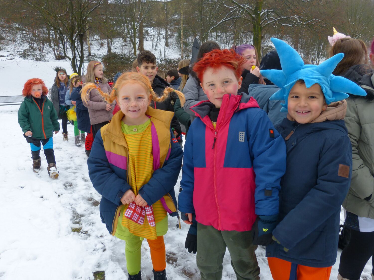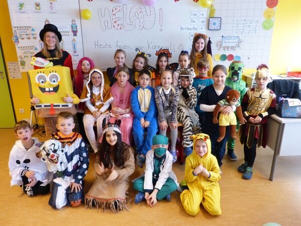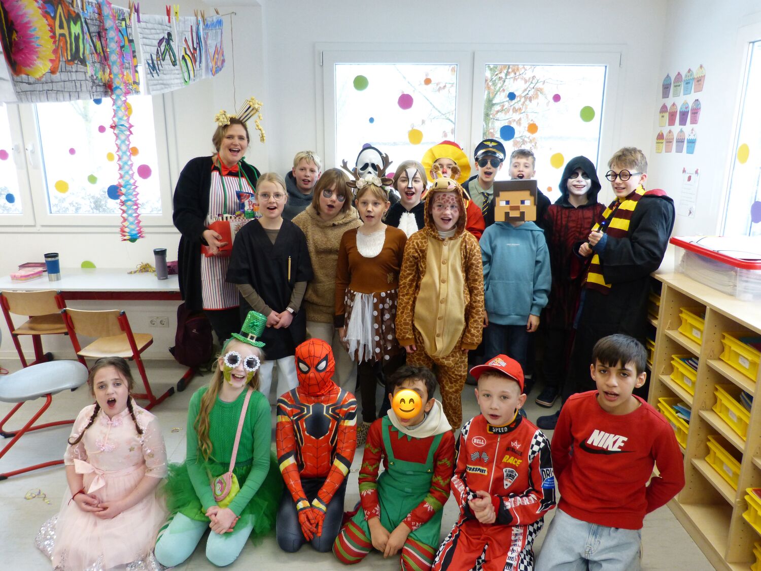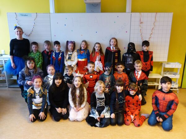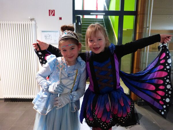 Dort wurde getanzt, gelacht und gespielt. Nach einer Polonaise durch die Schule tanzten alle Kinder ausgelassen in der Aula. Im Anschluss wurden die Jacken übergezogen und Tüten zum Süßigkeiten sammeln bereit gemacht, denn wie jedes Jahr machten wir mit der gesamten Schule einen Rundgang durch Bad Bentheim. Der Streckenplan wurde im Vorhinein bekannt gegeben, sodass viele Eltern an den Wegen entlang Süßigkeiten warfen und die Kostüme der Kinder bestaunen konnten.