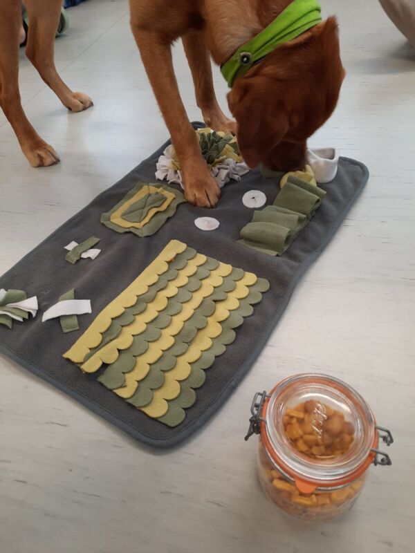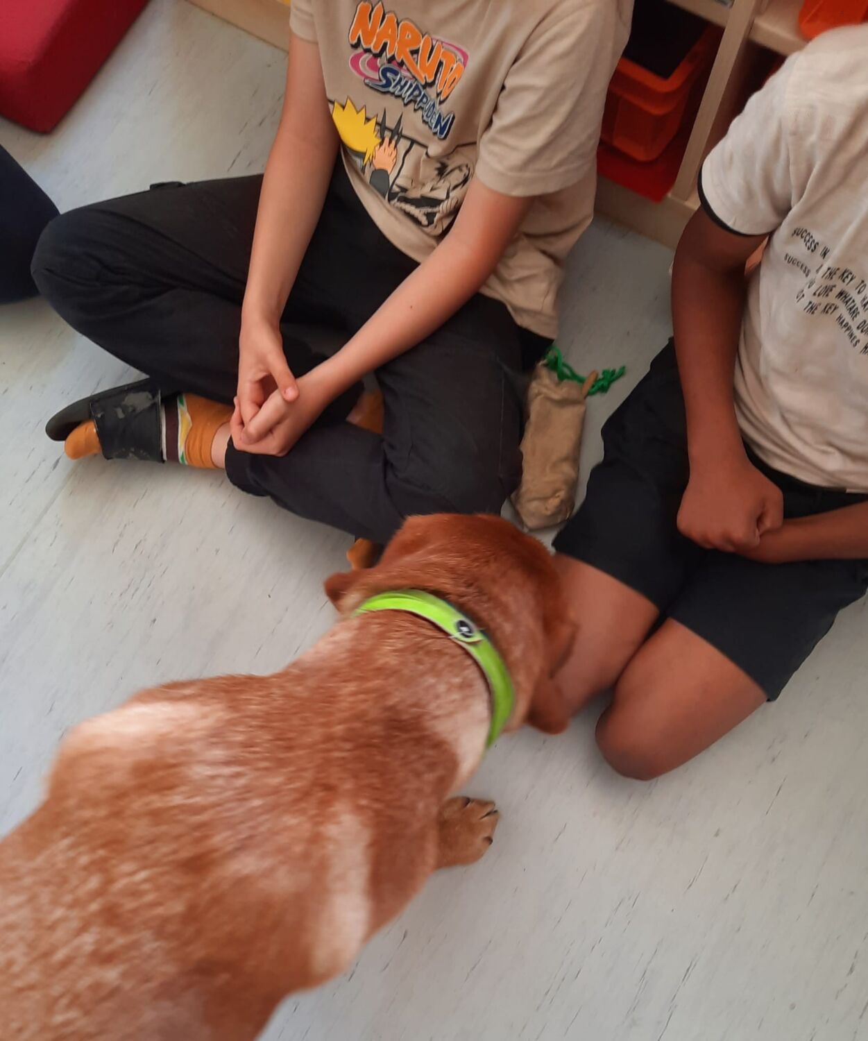 In den Klassen, in denen ich öfter bin, darf ich hin und wieder auch ein bisschen im Unterricht mitmachen. Manchmal verstecken die Kinder vor der Frühstückspause Leckerlis in einem Schnüffelteppich für mich, die ich dann finden soll. An anderen Tagen darf ich mein Apportiersäckchen suchen und holen, in dem dann für mich die Leckerlis und für die Kinder die Aufgaben sind. Sie können dann mit den Aufgaben weiterarbeiten und ich darf dem Geschehen wieder entspannt von meiner Koje zusehen.