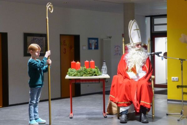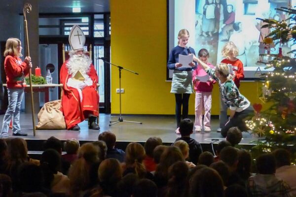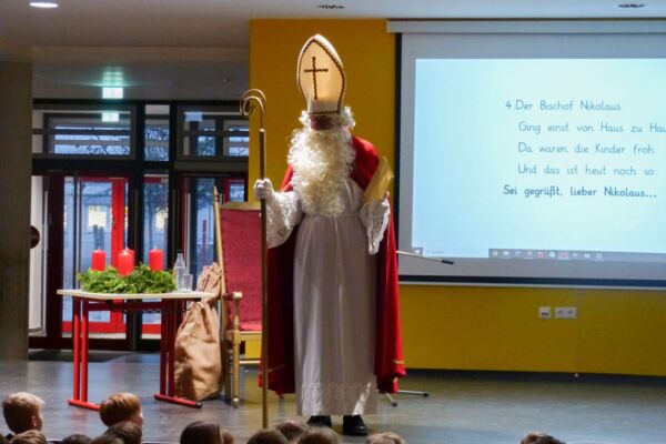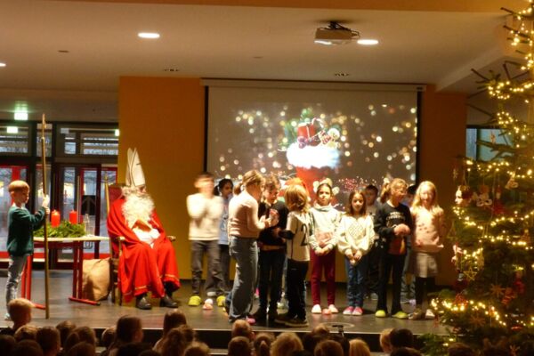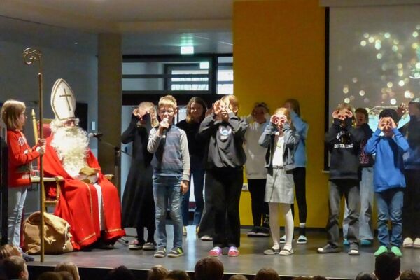 Natürlich hatten die Klassen etwas zur Feier des Tages vorbereitet und sangen, tanzten oder musizierten auf der Bühne. Der Nikolaus war schlichtweg begeistert, lobte die Kinder und freute sich über die Aufführungen. Ein paar Kinder konnten dem Nikolaus dann noch eine Frage stellen und bedankten sich für die gefüllten Stiefel bei ihnen zuhause.