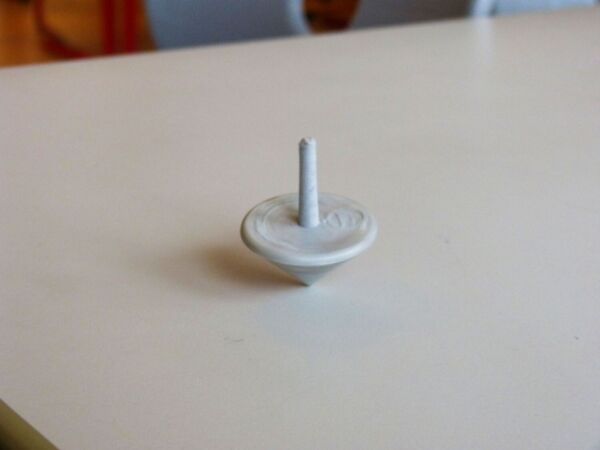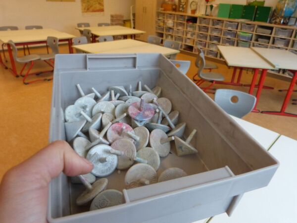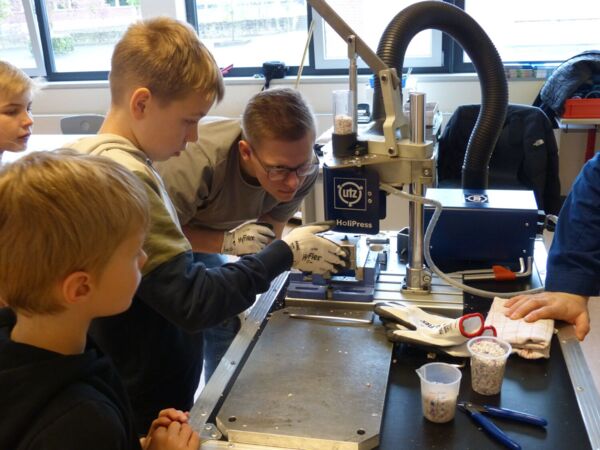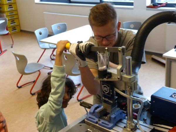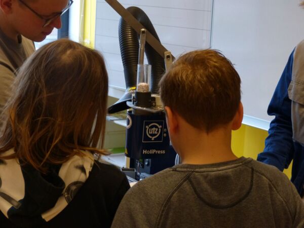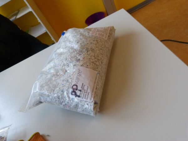 Das Highlight des Projekts war, als die Firma eine kleine Spritzguss Maschine mitgebracht hat und die geschredderten Joghurtbecher zu Kreiseln geformt wurden.