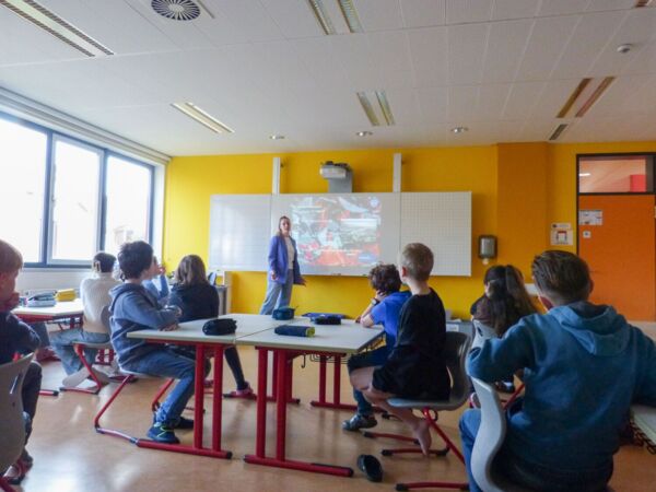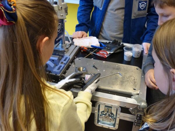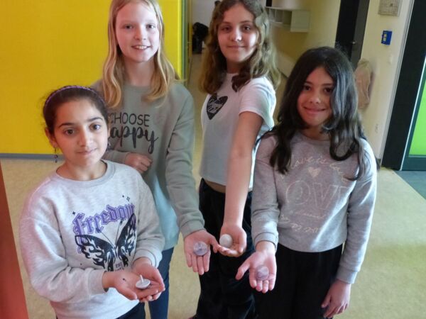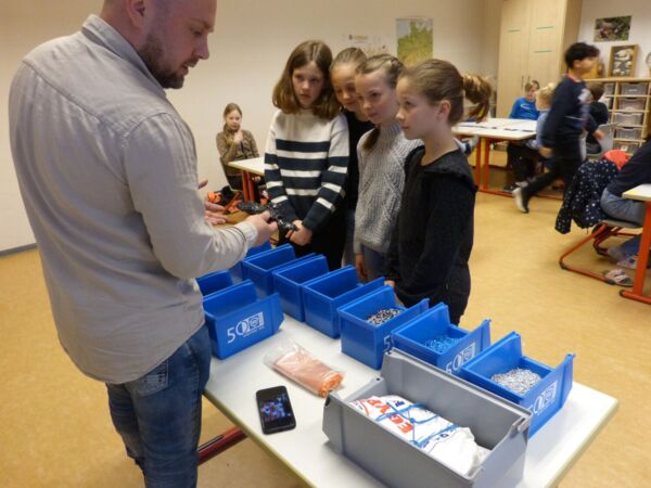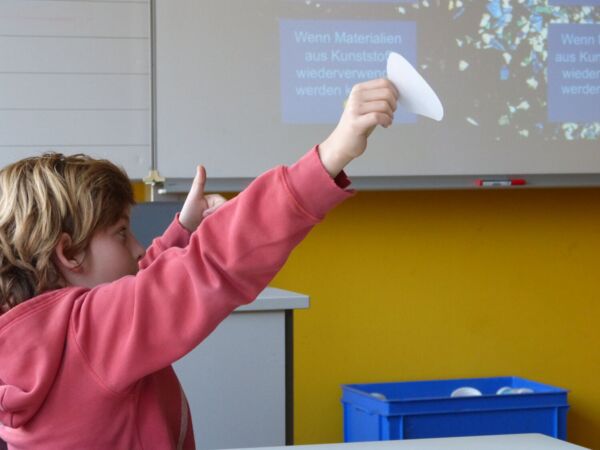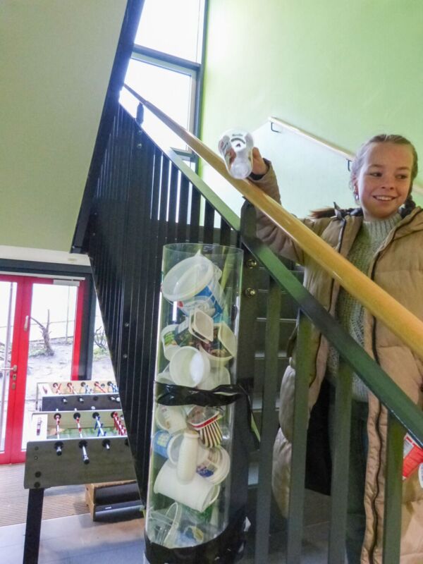 Dafür haben die Kinder im Vorfeld Joghurtbecher gesammelt. In einer großen durchsichtigen Säule wurden sie für die Kinder sichtbar im Schulgebäude ausgestellt. Mitarbeitende der Firma UTZ sind im Rahmen des Projektes in die Schule gekommen und haben den Kindern einiges über Kunststoff und die Materialaufbereitung in der Firma vorgestellt.