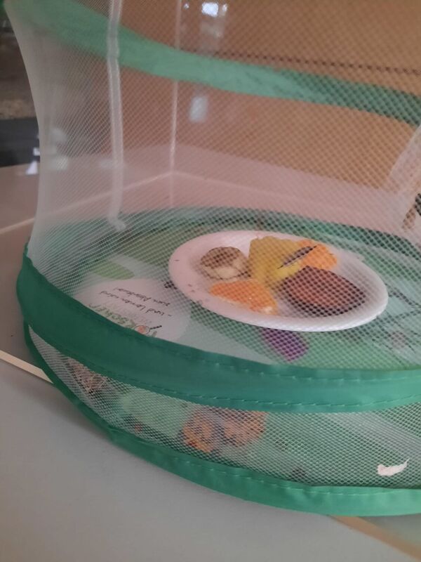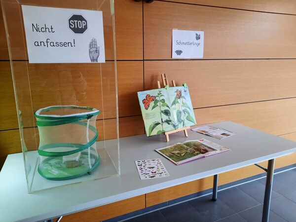 Jeden Tag konnten die Kinder in der Schule die Schmetterlingsraupen beim Wachsen beobachten, sehen, wie sie sich verpuppt haben und anschließend nach dem Schlüpfen in der Voliere herumflatterten und von der Banane und dem Zuckersaft naschten.