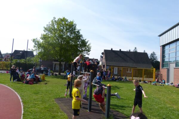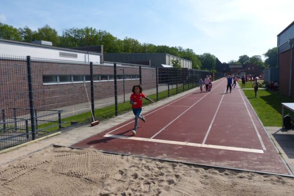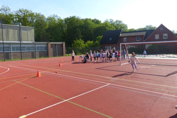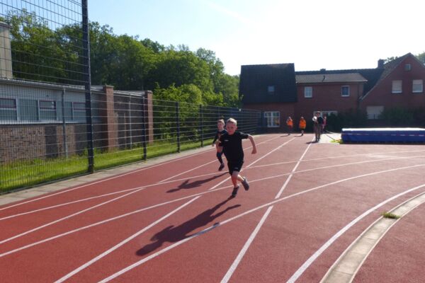 Heute sind die Kinder des dritten und vierten Jahrgangs zum Sportplatz beim Burggymnasium gelaufen, um verschiedene leichtathletische Disziplinen für das Sportabzeichen zu durchlaufen.