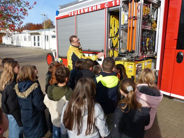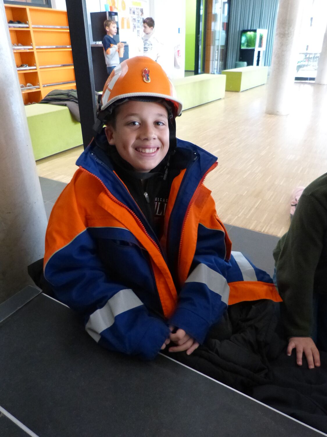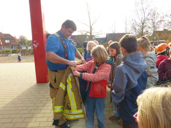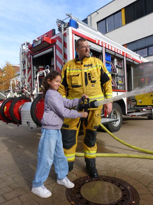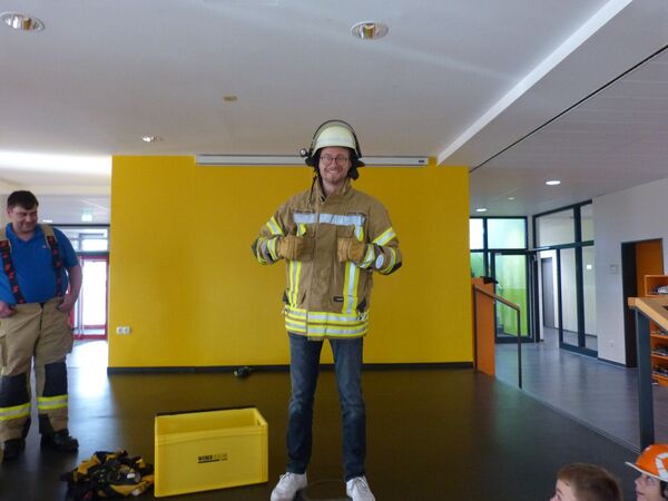 Wir alle durften einmal den Schlauch an und ausmachen. Dazu muss man einen Hebel am Schlauch betätigen. Zum Schluss wurde uns die Einsatzkleidung der Feuerwehr gezeigt. Alle Kinder durften sich die verschiedenen Sachen anziehen, so wie Handschuhe, Helme und Jacken.