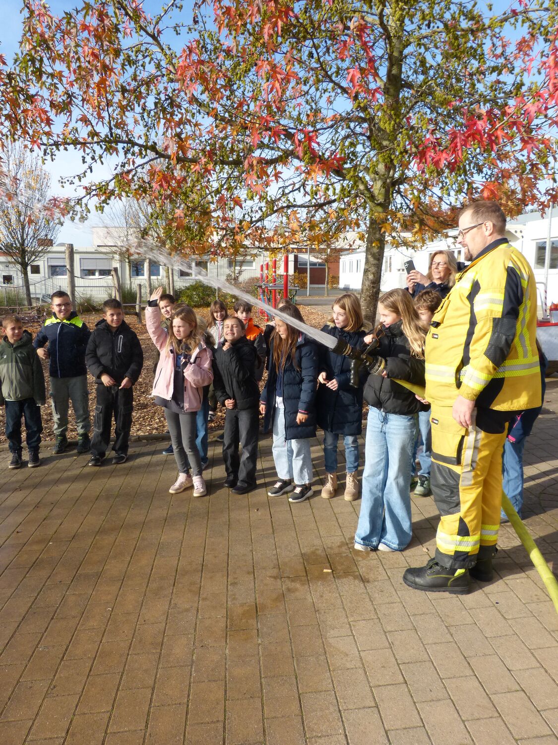 Dann durften wir in dem Feuerwehrauto einmal zur Probe sitzen. In ein Löschfahrzeug passen neun Personen rein, zwei vorne und sieben hinten. Dann wurde uns gezeigt, wie man einen Wasserschlauch benutzt.
