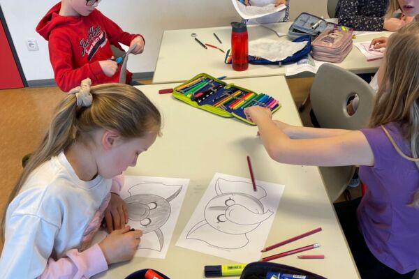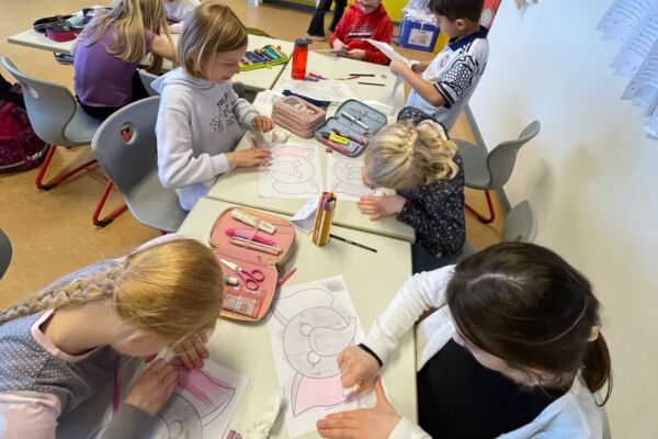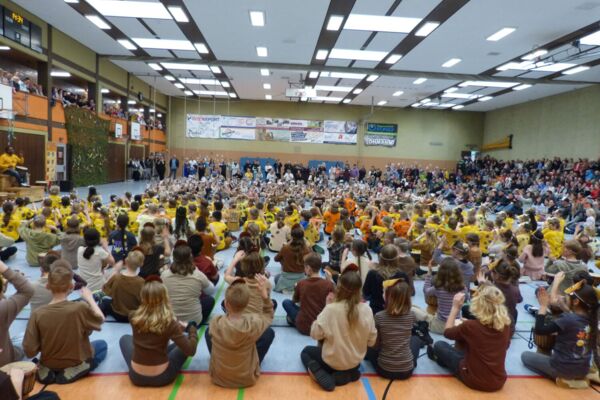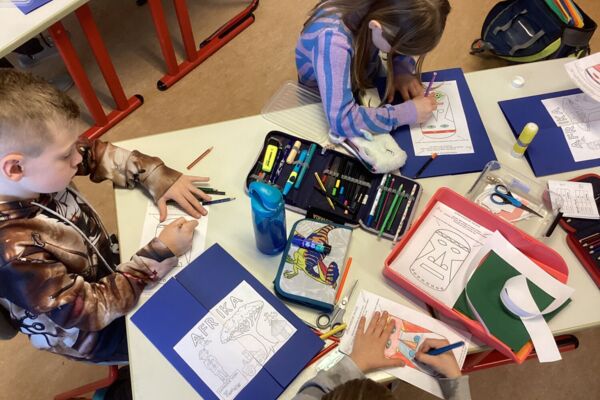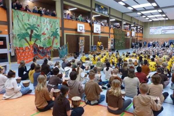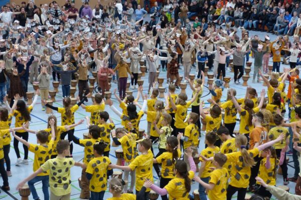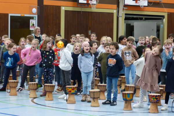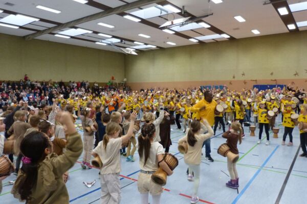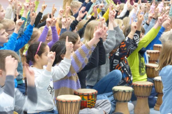 Wir Kinder und auch die Lehrer hatten richtig viel Spaß beim Trommeln. Fofo hat uns in Gruppen aufgeteilt: Die Viertklässlerinnen und Viertklässler waren Affen, die zweiten Klassen Giraffen, die dritten Klassen Elefanten und die ersten Klassen waren Gazellen.