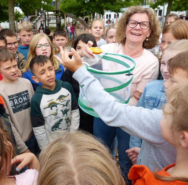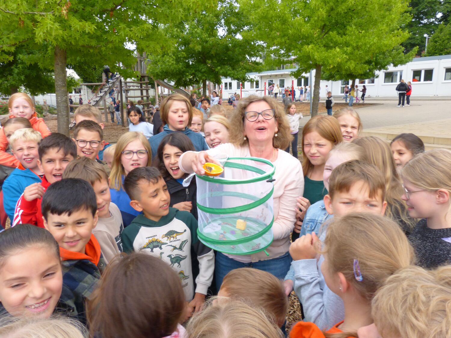 Wegen der Feiertage waren die Schmetterlinge länger als geplant zu Gast. Dank der mitgelieferten Zuckerlösung und einiger Apfelsinenscheiben haben alle sechs Distelfalter den Aufenthalt in unserer Schule gut überstanden. Aber nun ist es an der Zeit, unsere gezüchteten Schmetterlinge in ihren natürlichen Lebensraum zu geben und sie fliegen zu lassen. Heute, in der großen Pause, war es dann so weit: Alle Schmetterlinge starteten in ihre Freiheit. „Guten Flug Distelfalter!“